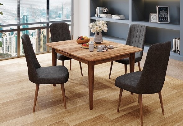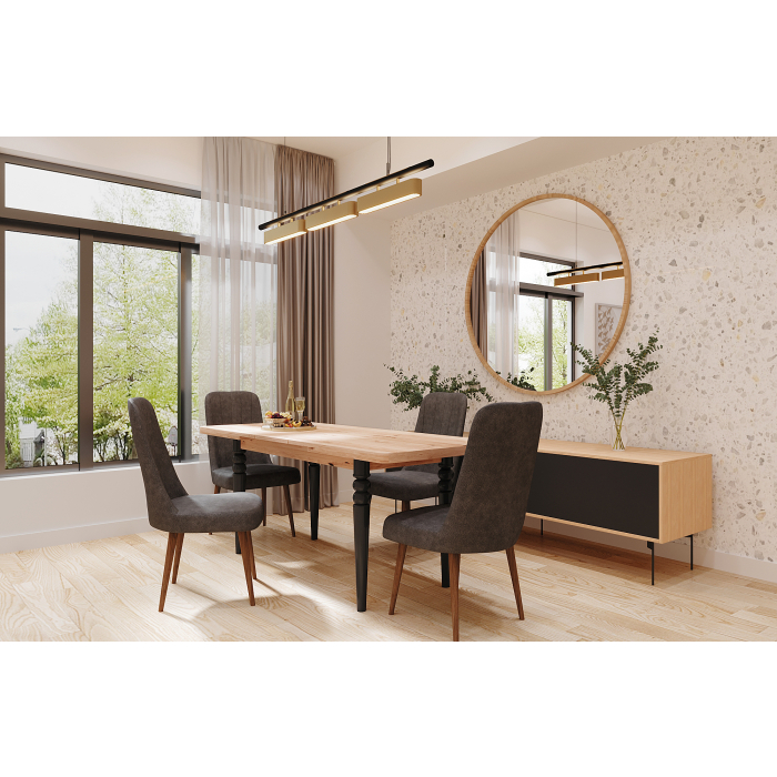 פינת אוכל בעלת מראה טבעי ומיוחד, רגליים מעץ מלא. עשויה עץ מלא בשלוב סנדוויץ' ולביד mdf לעמידות וחוזקה לאורך שנים. המערכת כוללת 4 כסאות מהודרים ונוחים. נפתחת בפתיחה קלה לגודל מרשים של 150 ס"מ. פינת אוכל גדולה ומרווחת שיכולה להכיל 6 עד 8 סועדים. רגלי השולחן עבות ומרשימות במיוחד. מגיעה בצבע עץ כהה אורינטלי.