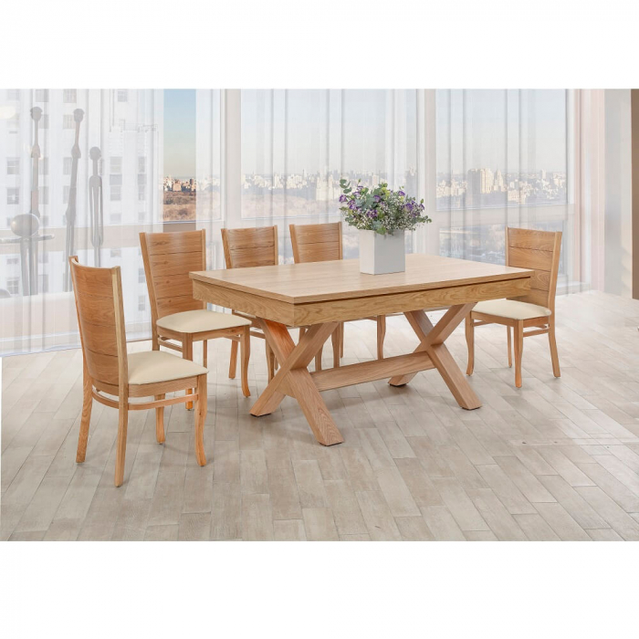 פינת אוכל מעץ מאסיבי ורגלי עץ בצורת איקס. דגם: לאונרדו. רגלי השולחן והמסגרת שלו עשויים מעץ מאסיבי. הפלטה העליונה עשויה מפורניר עבה ואיכותי. מבחינה עיצובית רגלי השולחן הן בצורת איקס. בכל צד של השולחן יש רגל איקס ובין שתי הרגליים מחברת קורה מרכזית.